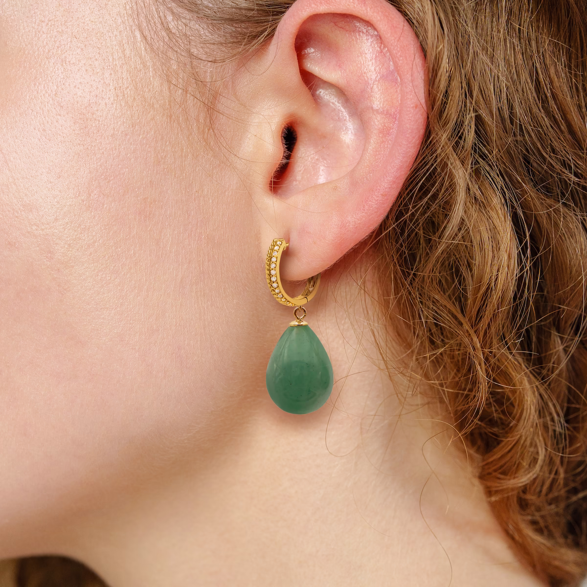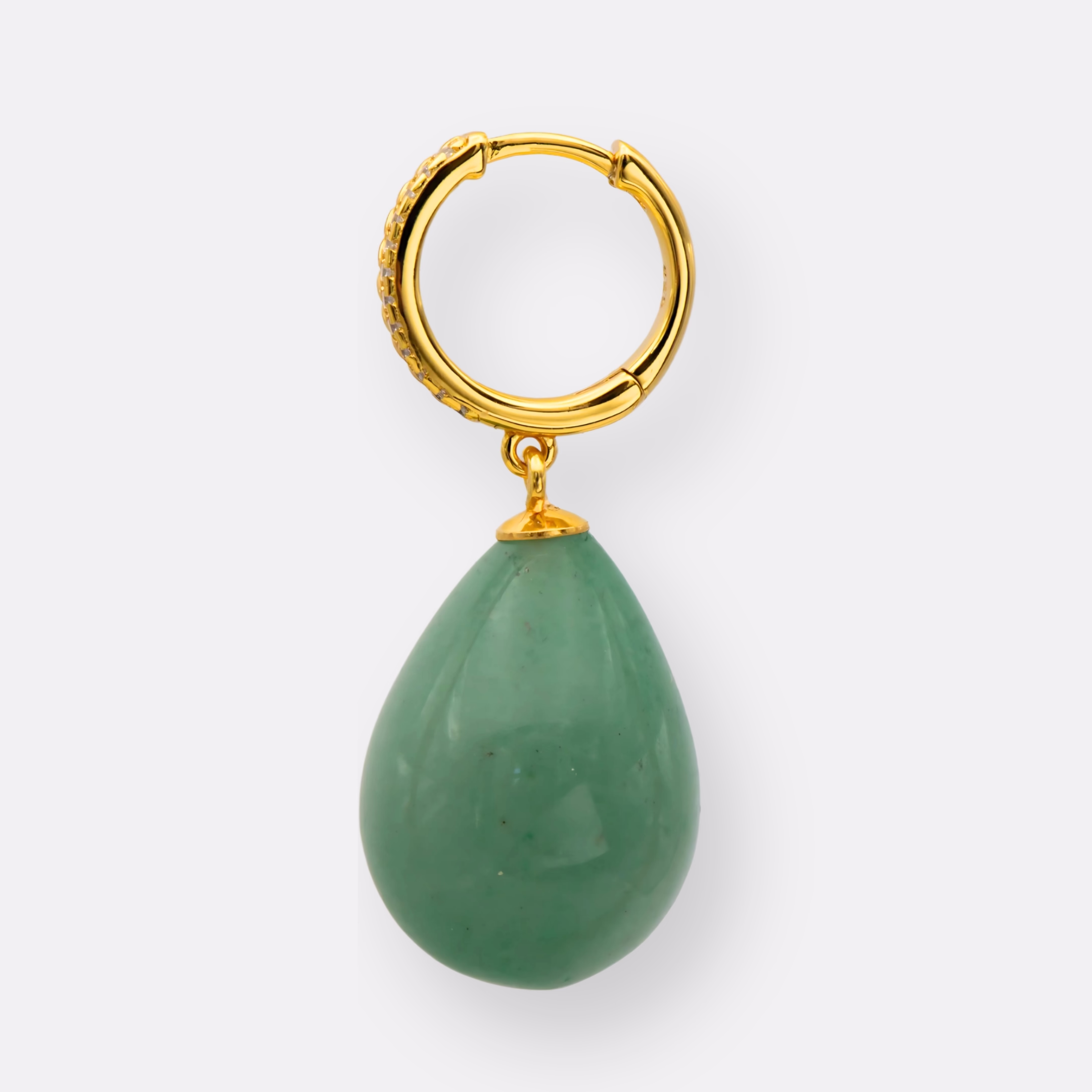 Lisa ist eine mittelgroße Creole aus vergoldetem Silber im edlen Kordel-Look, verziert mit funkelnden Zirkonia-Steinen. Der große Aventurin-Anhänger verleiht ihr eine kraftvolle Präsenz – dezent im Alltag, auffallend zu besonderen Anlässen.