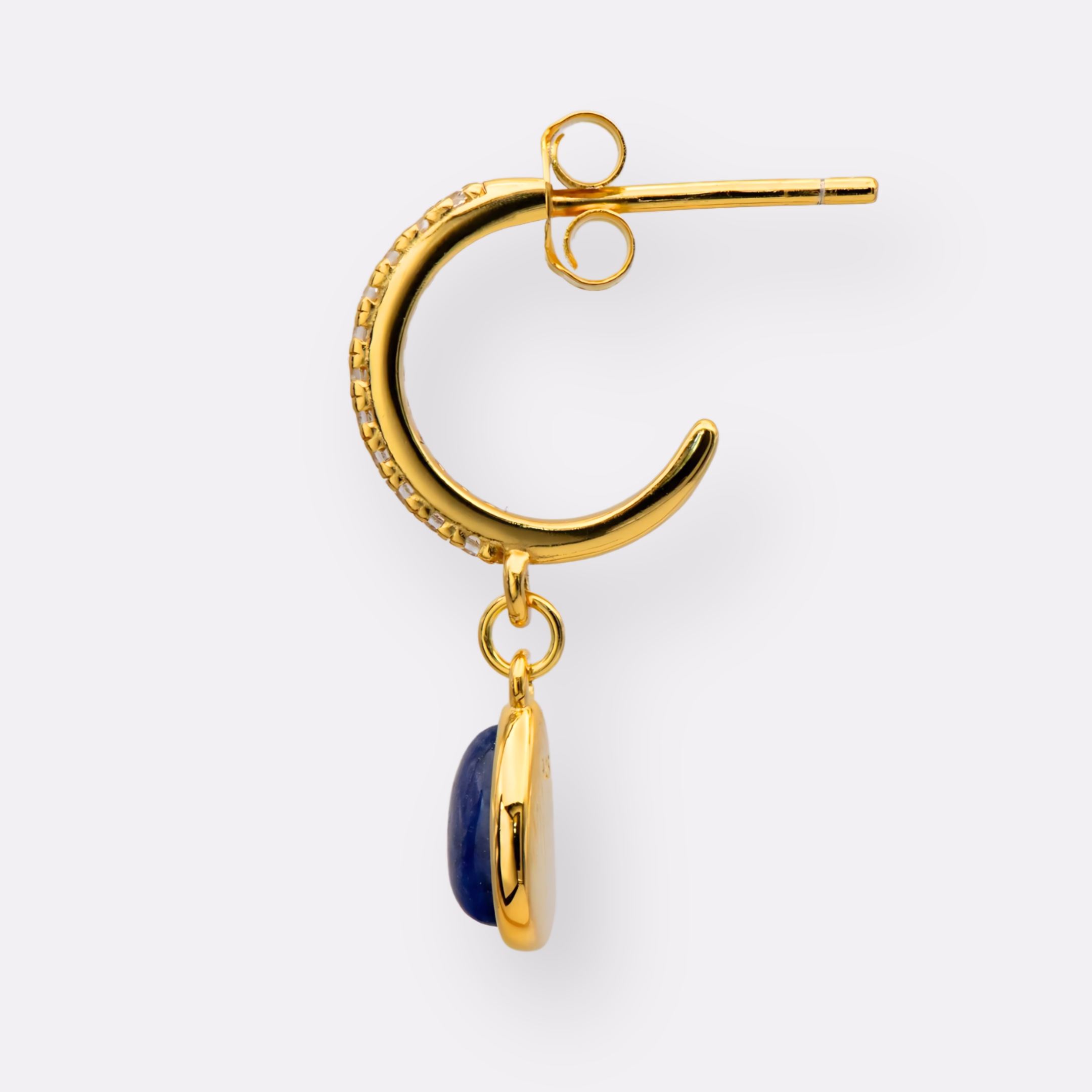 Unser Modell Sarah Kristall ist eine zarte Creole aus vergoldetem Silber, besetzt mit funkelnden Zirkonia-Steinen und geschmückt mit einem tiefblauen Lapislazuli-Tropfen. Ob im Alltag oder zu besonderen Anlässen – Sarah Kristall verleiht deinem Look eine elegante Note mit einem Hauch von Farbe.